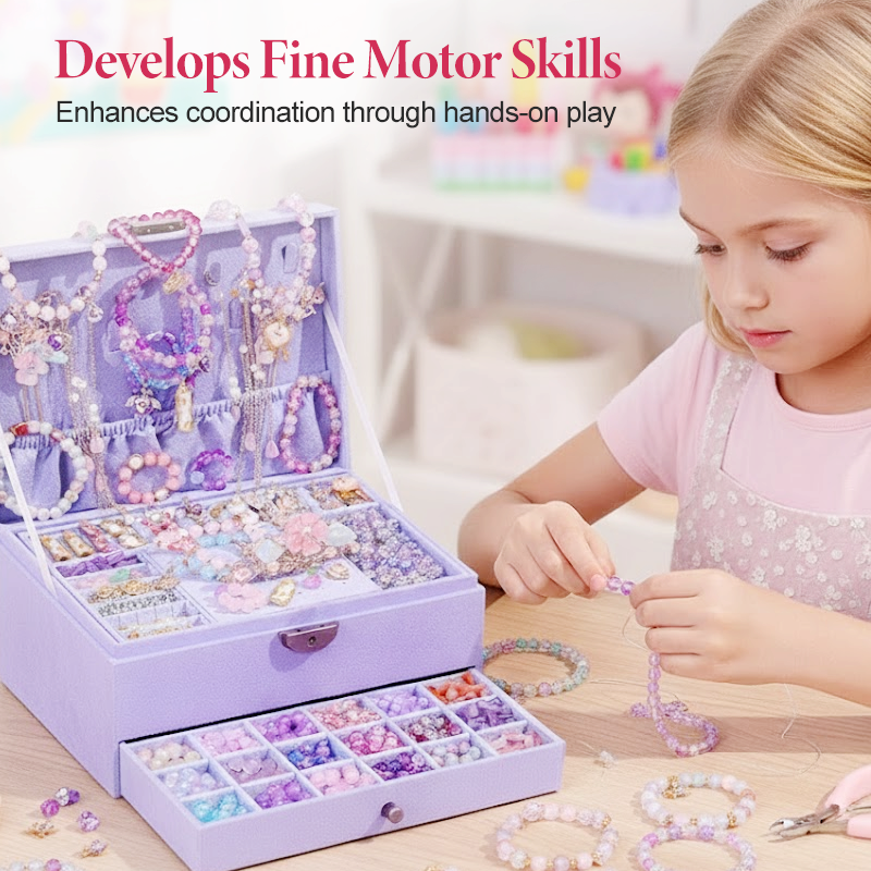 RIKT UTBUD AV PÄRLOR: Uppmuntrar till oändliga kreativa kombinationer, så att barn kan designa och skapa unika armband, halsband och accessoarer som speglar deras personliga stil och fantasi, vilket ger en känsla av tillfredsställelse med varje smycke.