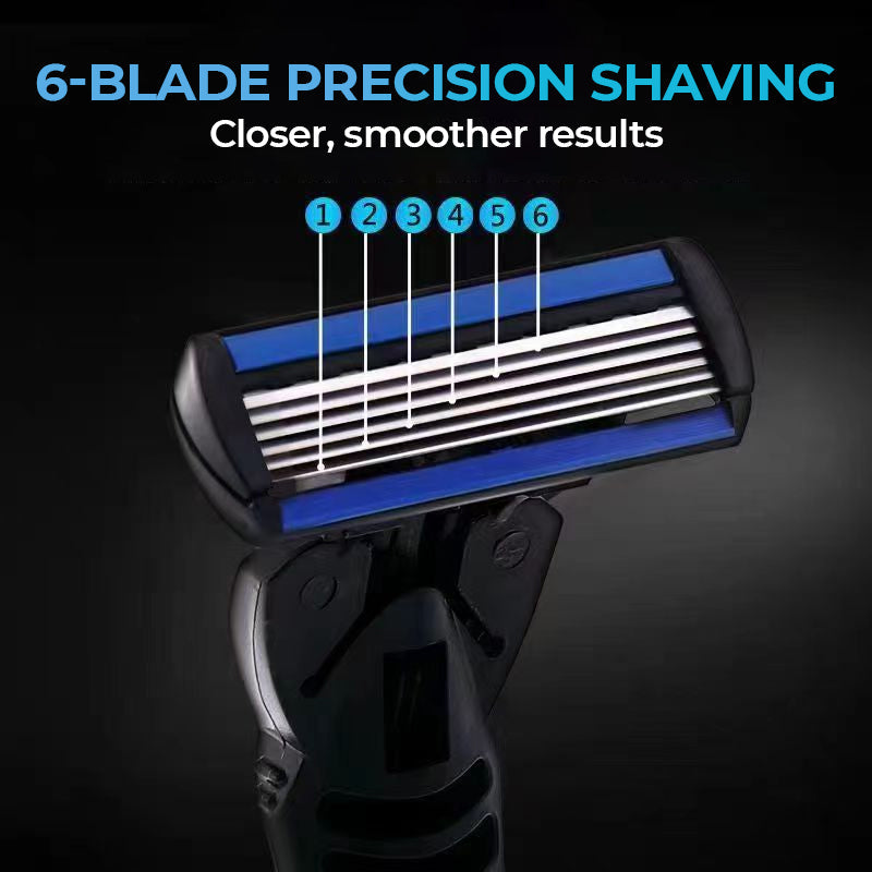 PROGRESSIVT 6-BLADSSYSTEM: Konstruerad med sex precisionsinriktade blad som progressivt klipper hår, minskar ryck och ger en ultranära rakning. Det vinklade arrangemanget följer ansiktets konturer, medan böjda L-formade blad säkerställer jämn tryckfördelning för jämna resultat.