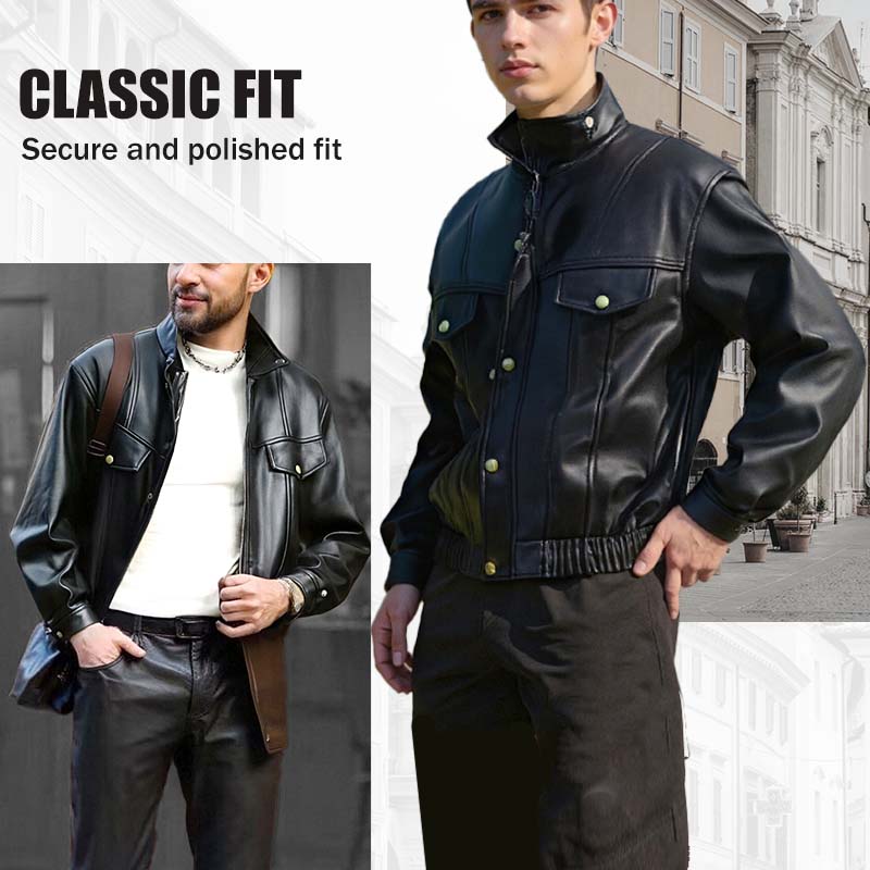 PREMIUM KONSTLÄDER: Denna jacka är tillverkad av högkvalitativt konstläder och har samma sofistikerade utseende som äkta läder, men med extra hållbarhet. Materialet har en slät struktur, är slitstarkt och behåller samtidigt sitt eleganta utseende. Detta garanterar ett hållbart plagg som är både snyggt och lättskött, perfekt för daglig användning.