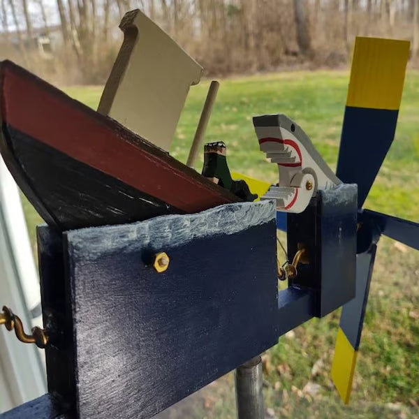 Denna JAWS Disaster Whirligig kommer att vara ett unikt tillskott till din trädgård och kommer garanterat att imponera på dina grannar, vänner och till och med förbipasserande! Ge din trädgård karaktär med vår vindspinnare för trädgården och skapa en stämningsfull atmosfär på din uteplats, gräsmatta eller i din trädgård.