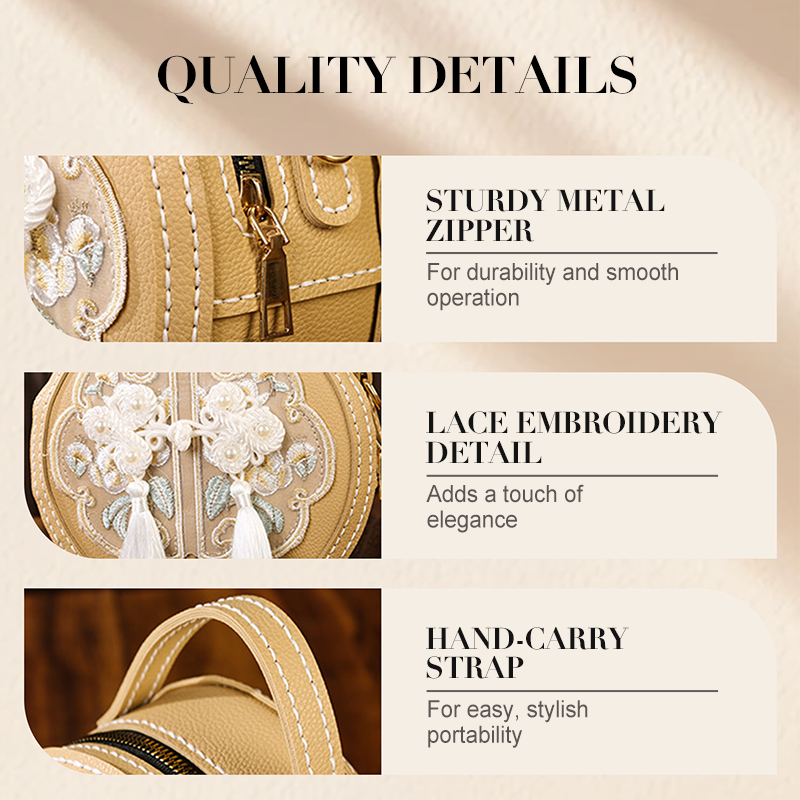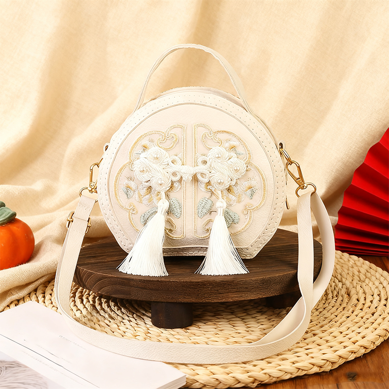 ELEGANT ESTETISK DESIGN – Den färdiga väskan har klassiska kinesiska kulturella motiv och utstrålar en raffinerad och tidlös charm. Den runda silhuetten och de detaljerade broderimönstren speglar traditionellt hantverk. Designen passar till olika kläder och ger din outfit en touch av kulturell elegans.