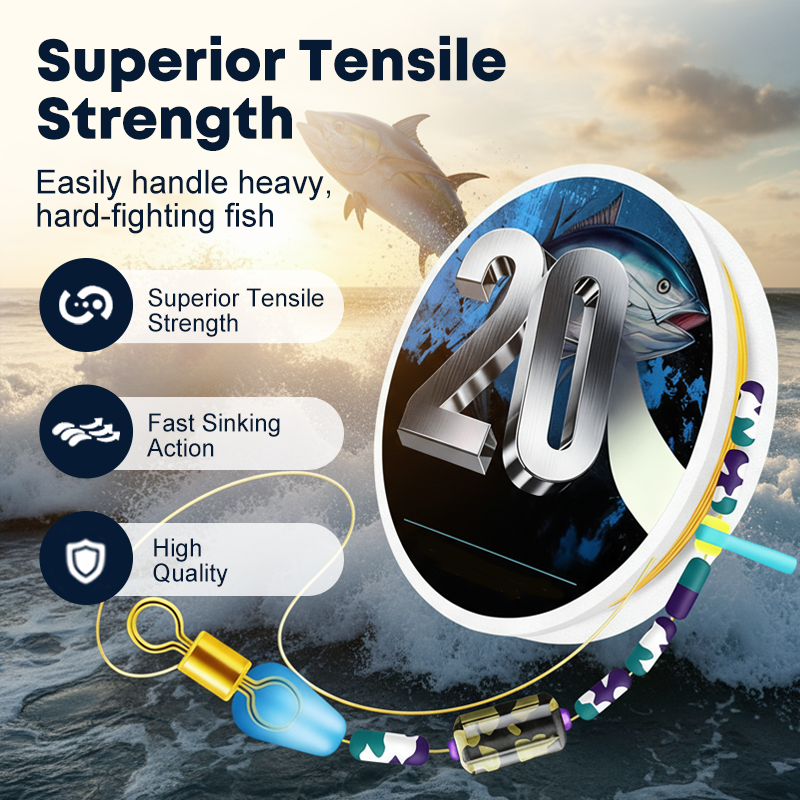 KNUTLÖS RIGGDESIGN – Denna innovativa konstruktion eliminerar svaga punkter som vanligtvis orsakas av knutar, vilket bevarar linans ursprungliga draghållfasthet. Du kan tryggt veva in större fångster utan att oroa dig för oväntade linbrott vid anslutningspunkterna.