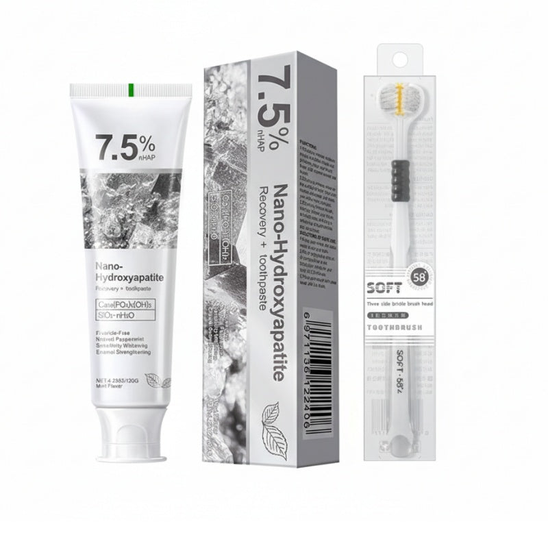 REPARATION OCH FÖRSTÄRKNING AV EMALJEN: Innehåller 7,5 % högrent nano-hydroxiapatit, ett biomimetiskt mineral som är identiskt med naturlig tandemalj. Tränger in i mikrosprickor för att främja remineralisering, reparera erosion i tidigt stadium och stärka försvagade områden – utan att skada den befintliga emaljstrukturen.