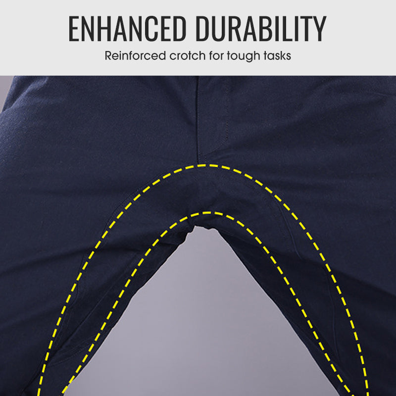 FÖRBÄTTRAD DUBBLELAGERFÖRSTÄRKT SKREV: Den dubbelagerförstärkta skrevsdesignen garanterar extra hållbarhet, särskilt vid tuffa arbetsuppgifter. Denna förbättring ökar motståndskraften mot slitage och rivningar, vilket gör byxorna perfekta för knästående, sträckningar och repetitiva rörelser.